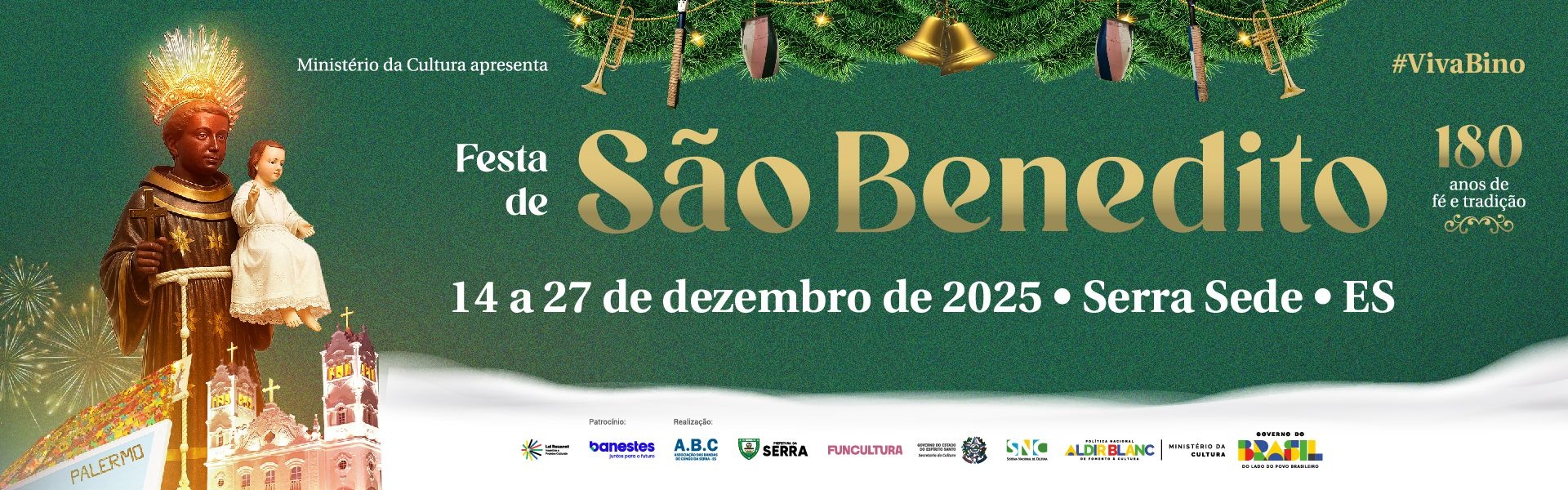 PROGRAMAÇÃO FESTA DE SÃO BENEDITO 2025 – 180ANOS DE FÉ E TRADIÇÃO SERRA SEDE 14/12 – domingo 17h - Cortadado Mastro 20/12 – sábado 18h - Desfiledas Bandas de Congo Mirim da Serra 24/12 – quarta-feira 5h - Alvoradade Natal com a Banda de Congo Konshaça e a Banda Estrela dos Artistas20h - Missa deNatal na Igreja Matriz 25/12 – quinta-feira 17h - Missa e Procissãode Natal e de São Benedito20h - Puxada doNavio Palermo com Bandas de Congo e a Banda Estrela...